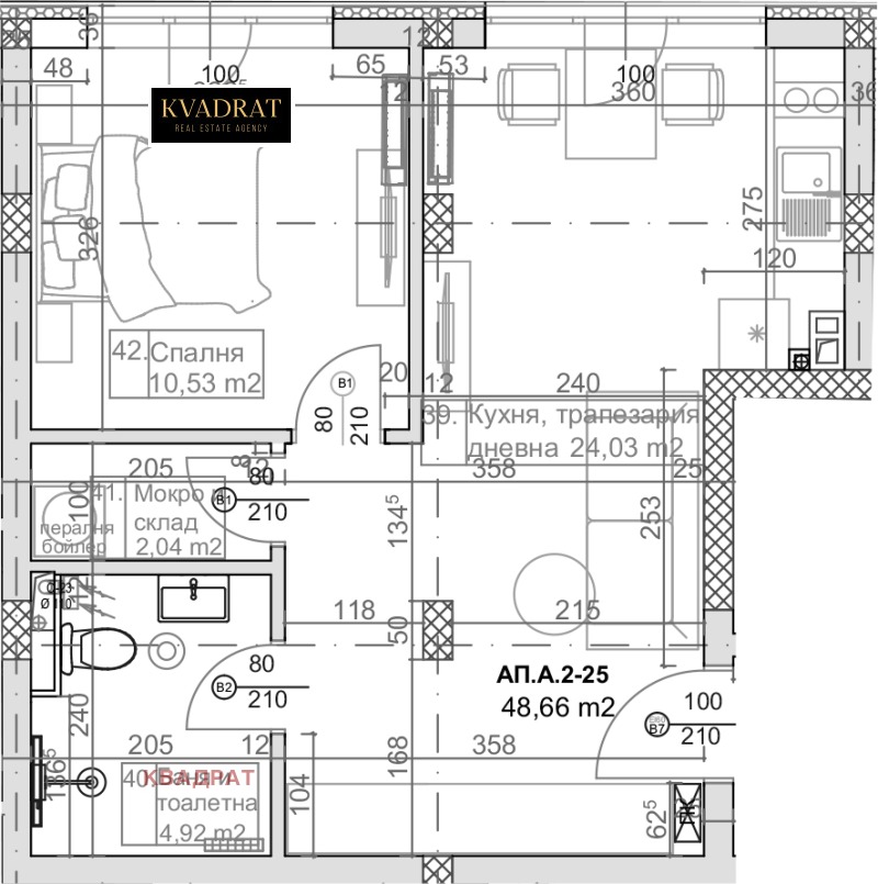 Апартаментът се състои от коридор, килер, баня с тоалетна, дневен тракт с кухненски бокс, една спалня.