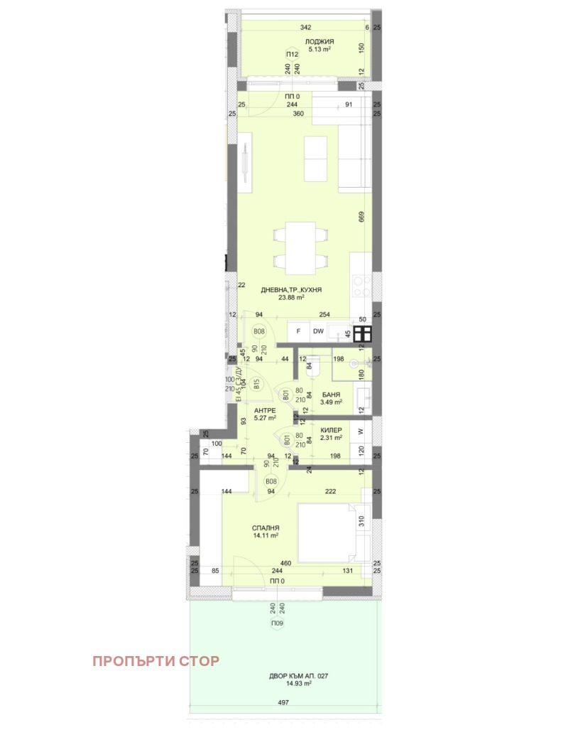Property store представя на вашето внимание двустаен, среден изцяло покрит, със собствен двор в сграда на етап разрешително за строеж.