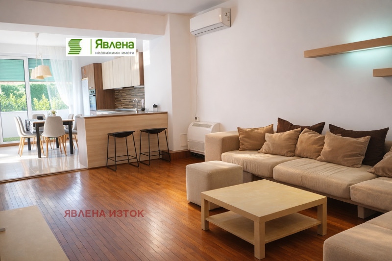 Явлена Изток предлага светъл отлично обзаведен четиристаен апартамент (самостоятелен етаж от къща - около 130кв реална площ) след ремонт на страхотна локация в близост до парк Борисова градина, Метростанция Жюлио Кюри, бивш хотел Плиска. Апартаментът се състои от голям хол с трапезария и кухненски бокс, три стаи, две мокри помещения (баня с тоалетна и мокро помещение с тоалетна), както и голяма тераса. В кухнята има печка, хладилник, миялна машина; пералня и сушилня; Хола е декориран артистично със скрито осветление, диван и др. Едната голяма стая е преходна към хола, обзаведена със спалня комплект, гардероб. Допълнително има две непреходни стаи. Озеленен и отлично поддържан двор. Паркирането е възможно във вътрешен двор в гараж срещу допълнително договаряне. Отоплението е с ТЕЦ (има допълнитлно и климатици). В близост на пешеходно разстояние има училище, детска градина, градски траспорт, много магазини и др. Към имота има мазе и таван, както и 25% от дворното място. Отлична инвестиция с много възможности.