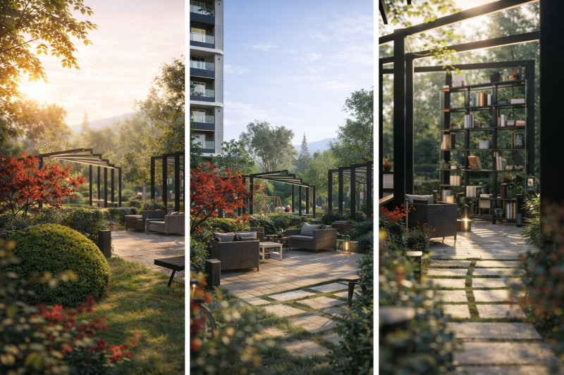 Южното изложение и френските прозорци осигуряват естествена светлина през целия ден и по-ниски разходи за отопление. Комплексът предлага: 8 000 кв. м частен парк, детски площадки, спортно игрище и открит фитнес, алея за джогинг, ресторант, зони за отдих с фонтани и богато озеленяване, контрол на достъпа.