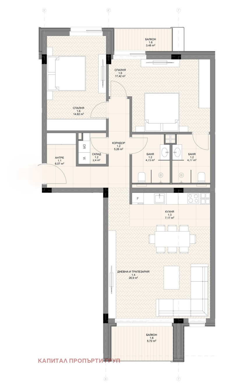 Две самостоятелни спални - 14 и 17 кв м , едната със собствена баня 🛏 ️ 🛏 ️