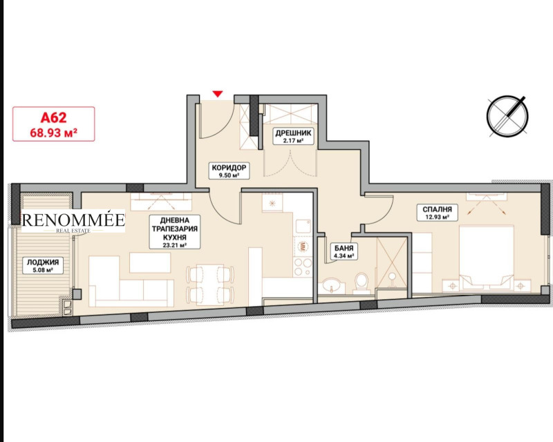 Разпределение - входно антре, голяма всекидневна с трапезария и кухня, спалня, баня с тоалетна, дрешник и лоджия. Към апартамента се продава и мазе.
