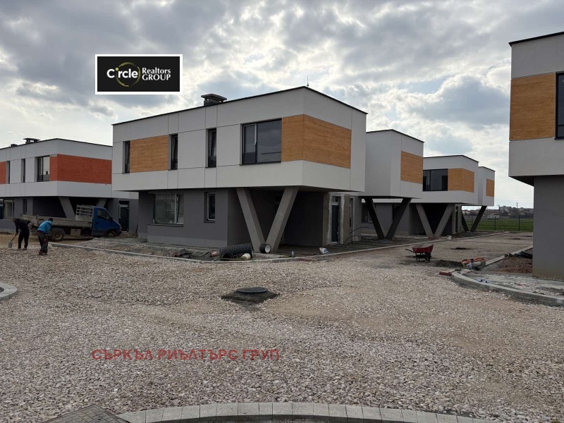 БЕЗ КОМИСИОНА ОТ КУПУВАЧИТЕ! Къща в затворен комплекс с 24 часа контролиран достъп, охрана, зелена паркова среда, детски площадки, магазин и заведение. Комплексът се състои от 44 броя къщи- близнаци с по три и четири спални. Всяка от тях разполага със собствен двор и паркоместа за два автомобила. Къщите се изпълняват от Главболгарстрой на четири етапа. Първо ниво: антре, санитарен възел, дневна с трапезария и кухня с излаз към двора. Второ ниво: антре, две спални с баня и тоалетна, мокро помещение, мастър спалня със собствена баня. Всяка къща има сервизно помещение с отделен вход. Комплексът е газифициран и свързан към канализацията.