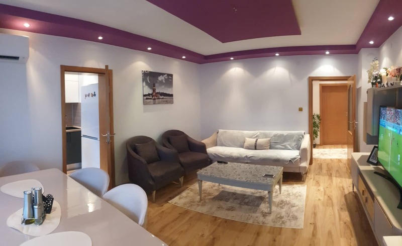 ТРИСАТЕН апартамент под наем в района на Болницата. Жилището е след основен ремонт, напълно обзаведено и оборудвано с всички необходими мебели и ел. уреди. Разпределение: кухня, хол с трапезария, две спални, баня с тоалетна, голяма южна тераса, коридор. Към имота има таван и изба. Отоплението е решено чрез климатик. Намира се в тухлена кооперация с отлично поддържани общи части.