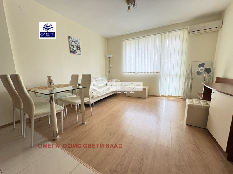 Недвижими имоти ОМЕГА Ви предлага двустаен обзаведен апартамент с площ 67. 00кв. м. на 2 етаж с разпределение:малък коридор, дневна с кухня, спалня, баня с тоалетна и една тераса с панорамна гледка към планината. Апартамента е обзаведен с мебели и техника, оборудвана баня с тоалетна. Имота е разположен в жилищна сграда намираща се в град Свети Влас. Разтоянието до морето е около 700м. Изключително тихо и спокойно место!Самостоятелни партиди на електричество и вода!