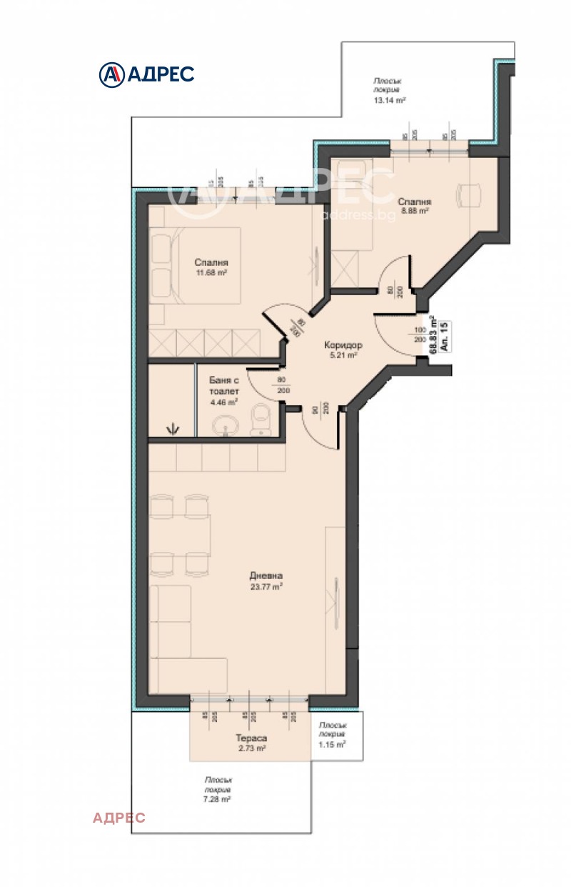 Жилището разполага с площ от 74 кв. м. разпределена в коридор, дневен тракт с кухненски бокс, две спални, балкон, баня и тоалетна.