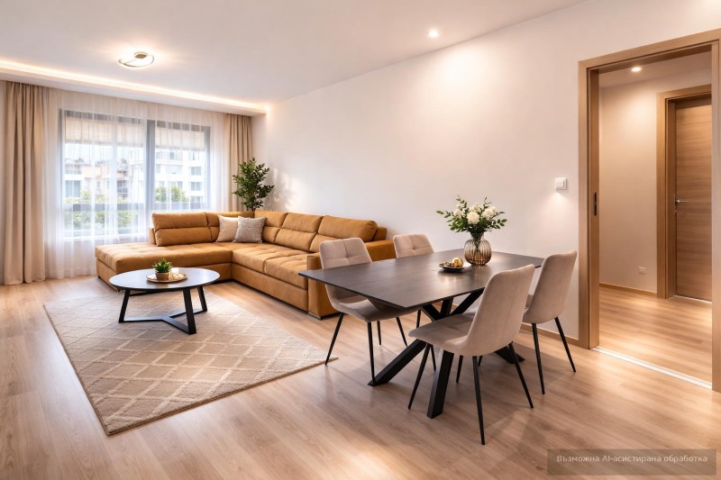 Имотът е ситуиран на 5-ти жилищен етаж и разполага с площ от 104 кв. м, разгърната в следното разпределение: входно антре, просторен хол с трапезария и напълно оборудвана кухня, две спални, две бани с тоалетни и тераса. Сградата е с асансьор.