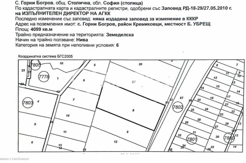 Земеделска земя, находяща се в с. Горни Богров, район Кремиковци, местност Б. Убрещ