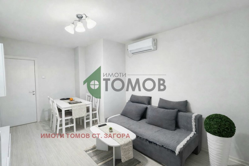 Имоти Томов Стара Загора представя на Вашето внимание компактен и слънчев двустаен апартамент под наем в кв. Казански, с площ от 55 кв. м. Имотът е с южно изложение и се намира на пети етаж в добре поддържана, осеметажна сграда с асансьор.