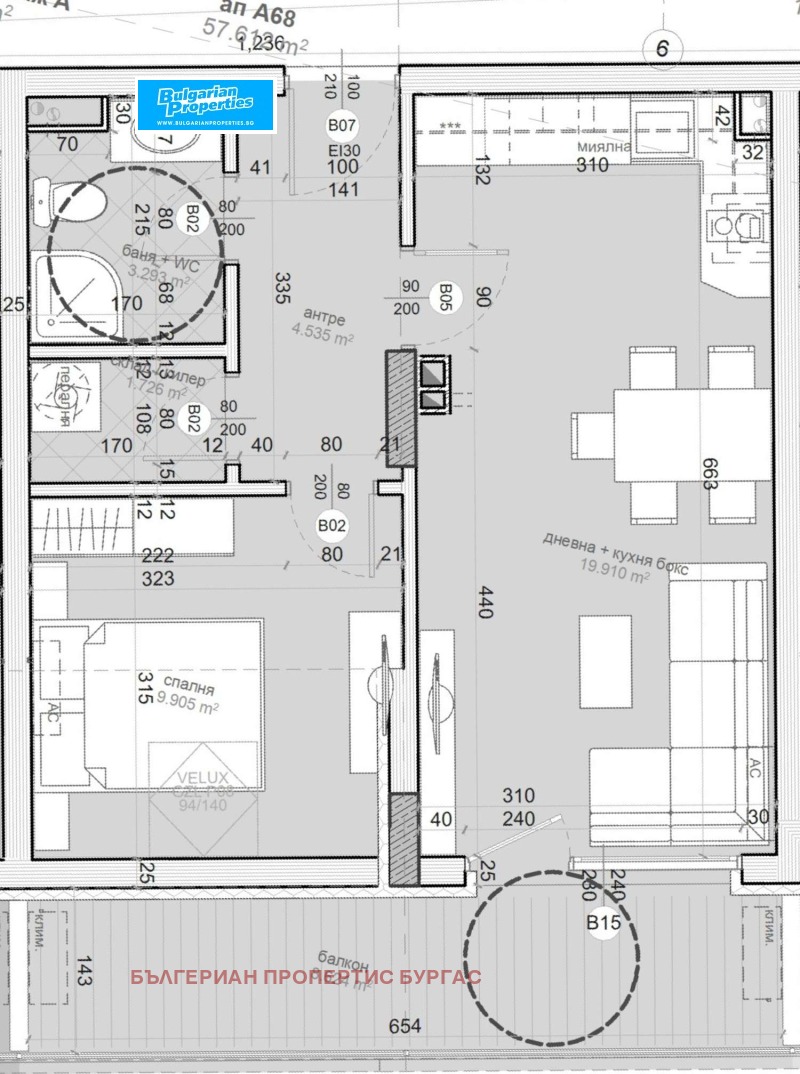 Апартамент A68 , обща площ 65. 73 кв. м. (нетна площ 56. 65 кв. м. + общи части 9. 08 кв. м. ).
