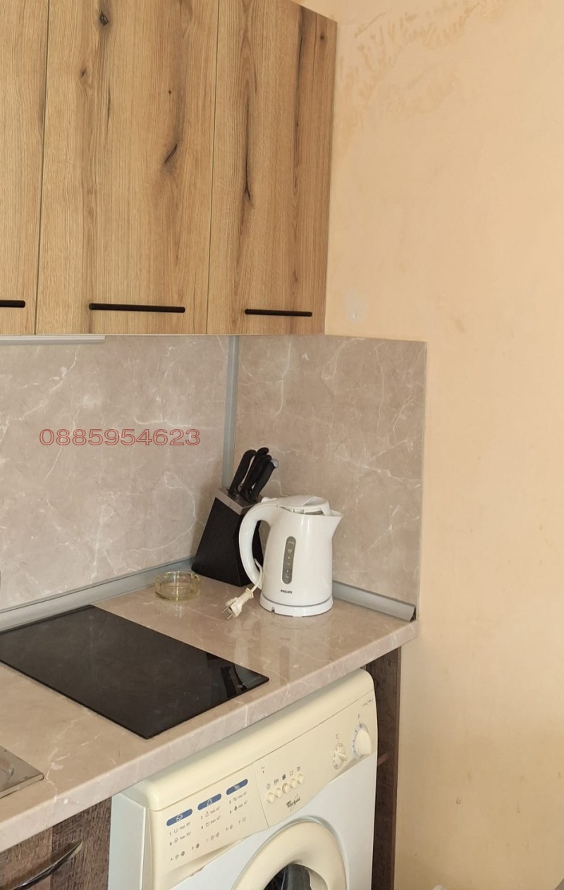 Обзаведена студио, има кухненски блок, котлон, перална машина, душ, балкон