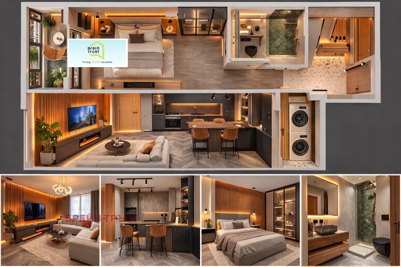 Жилището е с площ от 72 кв. м и се предлага напълно обзаведено, а интериорът е изпълнен по дизайнерски проект, с декоративни мазилки, стилна мебелировка и осветление, създаващи комфортна атмосфера.