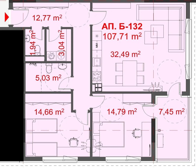 Апартаментът е ситуиран на 22-ри етаж с жилищна площ от 125 кв. м, разгърната в следното практично разпределение: хол с бокс кухня, спалня, детска стая, баня с тоалетна, мокро помещение .