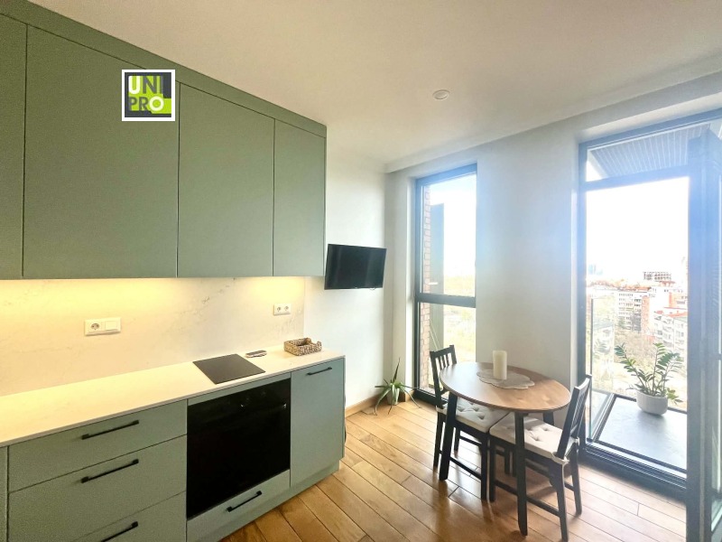 Модерен, панорамен апартамент в емблематичната сграда Red Apple, непосредствено до Южния парк. Състои се от дневна u кухненски бокс с кът за хранене, спалня, баня с тоалетна и тераса. Кухнята е обзаведена с модерни шкафове в цвят мента, с вградени уреди - хладилник с фризер, фурна, керамични котлони, абсорбатор, миялна и пералня. Уют на жилището придават естествения дъбов паркет и поръчковите мебели от естествен фурнир. Отоплението е с конвекторни радиатори, топлата вода е с централен ТЕЦ. От френските прозорци се разкрива панорама към центъра на София и Стара планина. Сградата е с отлична поддръжка, има денонощна охрана и видеонаблюдение. На партера на сградата се помещава известната пицария La Terra.