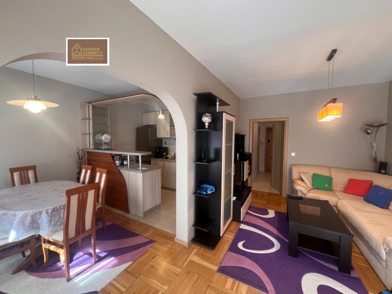 Имотът се състои от просторен хол с трапезарна и кухненска част, родителска спалня, детска стая само с гардероб и скрин(за нея ще се закупи необходимото, спроред нуждите на наемателя), баня с тоалетна( хидромасажна вана и прозорец) и голям балкон. Апартаментът е напълно обзаведен с всички необходими качествени мебели и с пълно оборудване с техника в кухнята. Налични пералня и сушилня в отделно помещение, допълнителна външна изолация на сградата. Жилището е с юг- изток- запад изложения, много слънчево и светло.