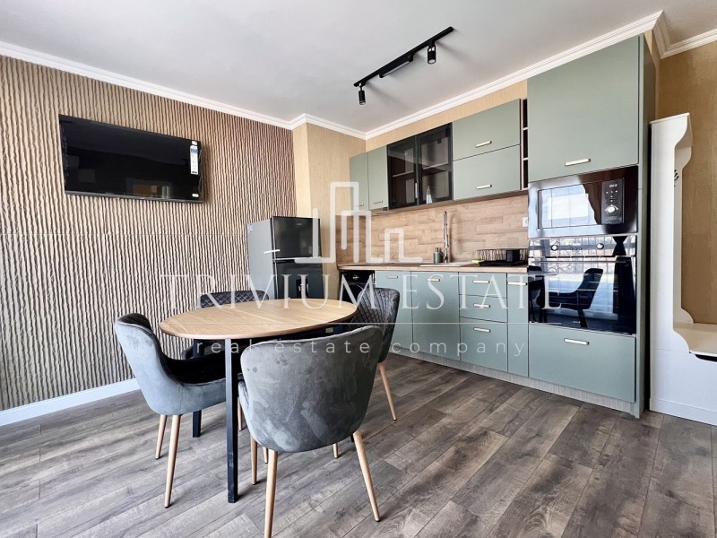 Апартаментът е напълно обзаведен и оборудван с висок клас електроуреди. Интериорът е съвременен, с внимание към детайла и удобството. Жилището е готово за нанасяне.