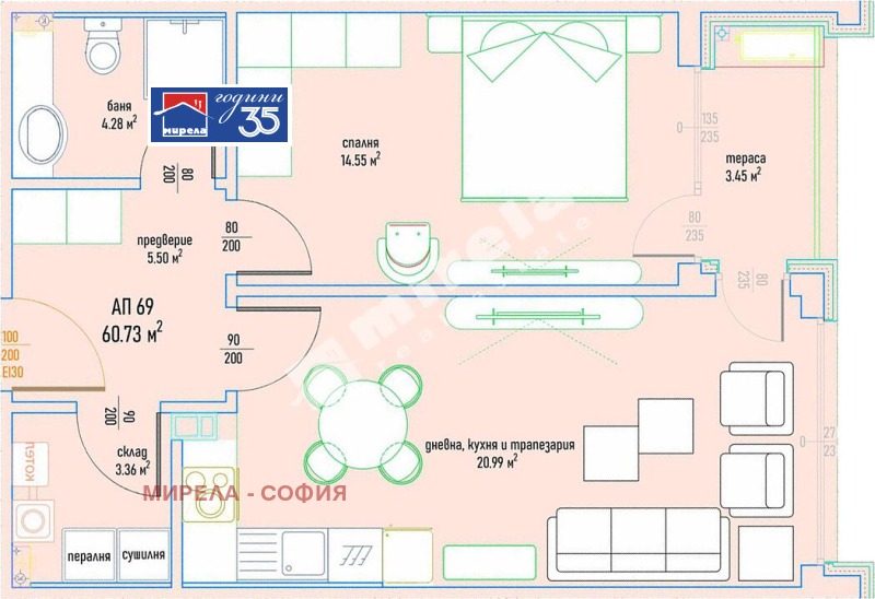 На площ от 72. 65 кв. м. са разположени антре, дневна с трапезария и кухня, спалня, баня, мокро помещение и двор (15, 30 кв. м) с източно изложение.