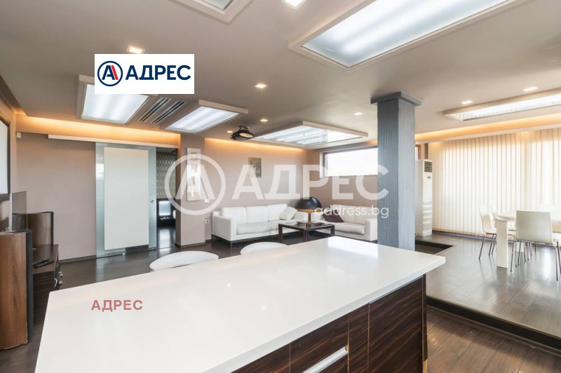 Представяме ви прекрасен многостаен апартамент тип пентхауз реално 280 кв. м. по документи 136. 47 кв. м. Състои се от коридор, / асансьора спира в самото жилище /, разчупена дневна / около 70 кв. м. /, обособена на кътове с кухненска част, три спални : две детски, / едната с баня с тоалет / по 12 кв. м. , 16 кв. м. и родителска 20 кв. м. с гардеробна и голяма баня с тоалет / с душ кабина и тангенторна вана /. Две тераси, едната около 100 кв. м. с монтирани тенти. Жилището е в много добро състояние с френски прозорци, вътрешни и външни щори, климатици във всяка стая и централна климатична система чилър. Дневната е с таван от гипсо картон с вградено LED осветление има прожекционна система. Покрива е допълнително изолиран с петслойна каменна вата и допълнителна топло и хидро изолация. Монтирани са два броя слънчеви колектори, които осигуряват топлата вода в жилището. Изложение изток, юг, запад. Към апартамента има подземно парко място.