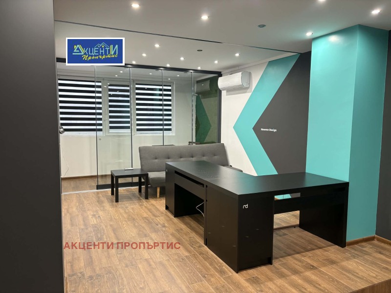 Агенция за недвижими имоти Акценти Пропъртис Ви предлагаме луксозно обзаведен офис, находящ се в бизнес сграда с контрол на достъпа, разположена в идеалния център на гр. Велико Търново. Офисът е с площ от 51 кв. м. , разположен на междинен етаж и се състои от помещение с обособен кухненски бокс и тераса, приемна и санитарен възел. Отдава се обзаведен и оборудван във вида на снимките. Отоплението и охлаждането е решено с висок клас климатик. В наемната цена е включен интернет. Номер на офертата 10326.
