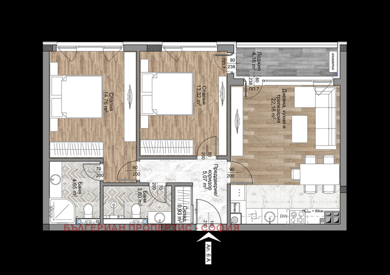 Апартамент A6 , обща площ 93. 48 кв. м. (нетна площ 80. 13 кв. м. + общи части 13. 35 кв. м. ).