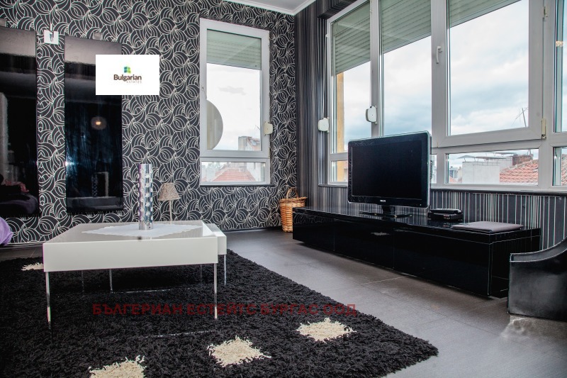 Модерен тристаен апартамент под наем в центъра на град Бургас, намиращ се на пешеходно разстояние от Морската градина, детска градина, училище, ресторанти, автобусна спирка, множество магазини, учреждения и офиси. Сградата е с асансьор и много добре поддържани общи части.