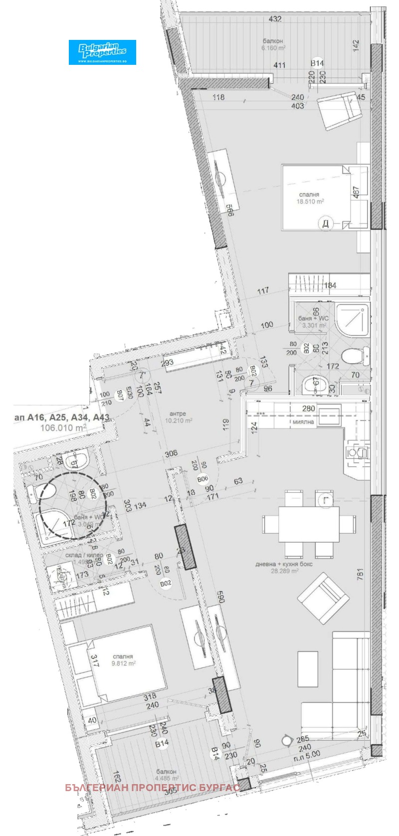 Апартамент A34 , обща площ 117. 82 кв. м. (нетна площ 99. 58 кв. м. + общи части 18. 23 кв. м. ).