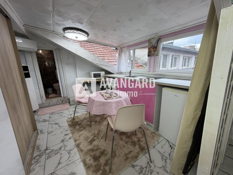 Имотът е ситуиран на 4-ти, последен етаж в сграда старо строителство и предлага практично разпределение: основно помещение с обособена кухненска част, зона за спане и допълнителен кът за второ легло, както и санитарен възел.