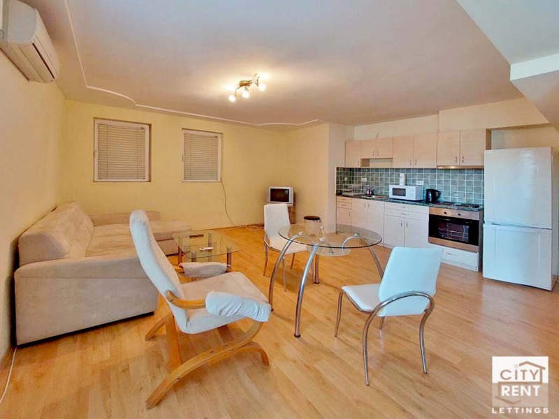 Уютното жилище се предлага напълно обзаведено, с напълно оборудвани баня и кухненска част. На разположение на наемателите са готварска печка, абсорбатор, хладилник, микровълнова фурна и пералня. Отоплението е на ток с наличен климатик, осигуряващ комфортна температура през цялата година.