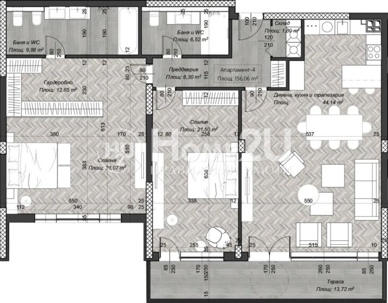 входно антре, хол + кухненски бокс 44, 14кв. м. , две спални (едната тип енсюит + гардеробно), още една баня с тоалетна, склад, тераса 13, 72кв. м.