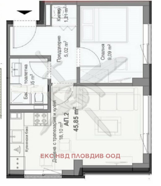 РАЗПРЕДЕЛЕНИЕ:Разполага с площ от 52 кв. м. разгърната в следното функционално разпределение: хол с кухненски бокс, спалня, предверие, килер, баня с тоалетна