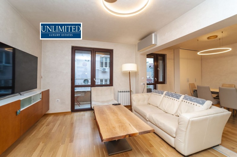 We present a beautifully furnished and modern apartment in a new, representative building with daytime live security, controlled access, and an elevator, ideally located on a quiet street in the very heart of Sofia city center, just a few steps from Denkoglu Street and Knyaz Boris I Street, and a short walk from Vitosha Boulevard.