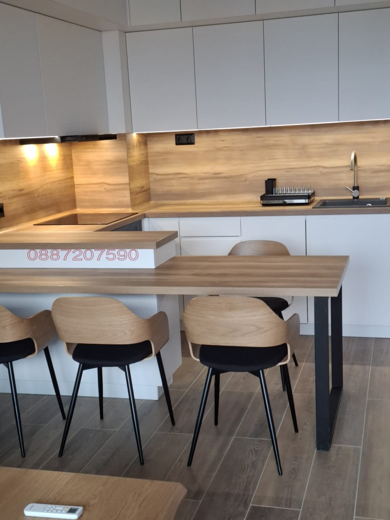 - Във всекидневната е монтирана кухня оборудвана с вграден хладилник, миялна, пералня, и фурна. Значително складово пространство. Маса и столове за хранене и кът с мека мебел.