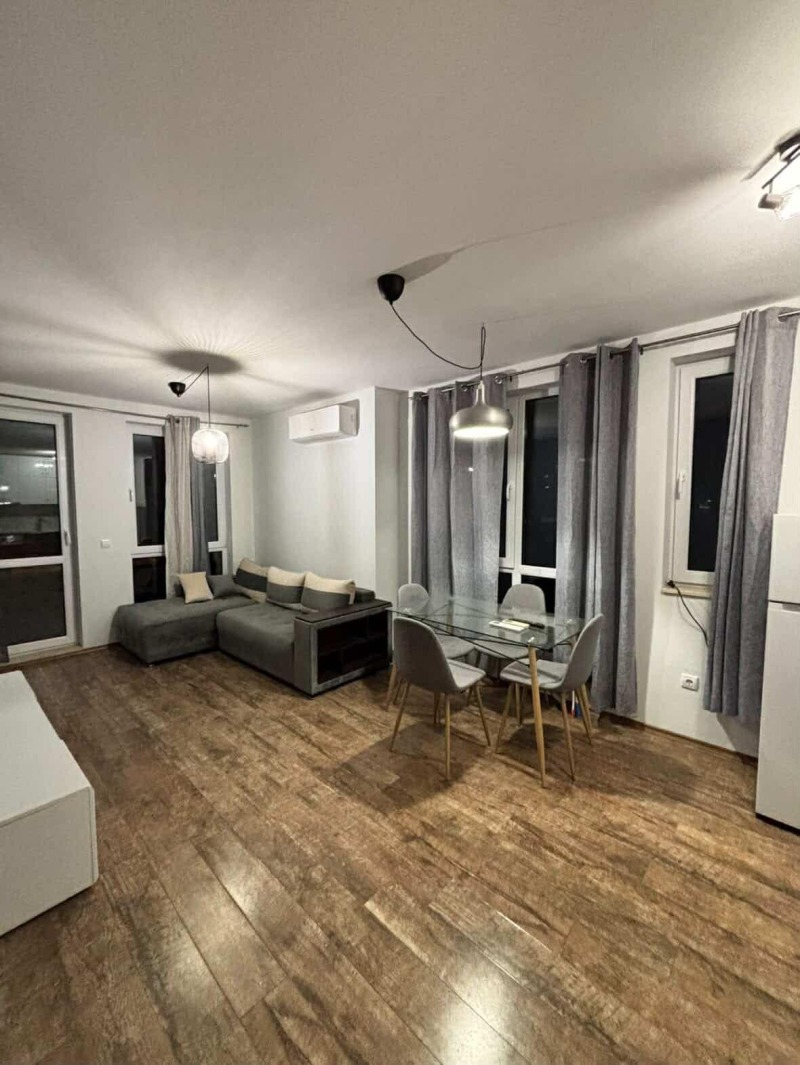 Ярък двустаен апартамент (60 кв. м) с хол и кухненски бокс, спалня, баня с тоалетна и тераса с източно изложение. Напълно обзаведен с отопление на ток, предлага две паркоместа и модерни довършителни материали. 🏢 ✨