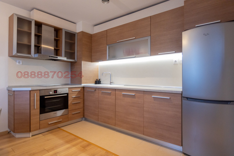 Отдава се под наем тристаен апартамент със застроена площ от 113. 00 кв. м. , напълно обзаведен. Състои се от хол с трапезария, две спални, баня с WC, самостоятелно WC, мокро помещение с автоматична пералня и сушилня, голям коридор и две тераси. Апартаментът е оборудван с ел. уреди- фурна, котлони, аспиратор, хладилник, съдомиялна за 6 комплекта, три инверторни климатика ' Fujitsu; , два телевизора- ' Самсунг' 49 инча и 42 инча. Отоплението е на газ с котел ' Имергаз' или на ток. Местоположение- бул. ' Черни връх' 122. Има възможност за наемане на надземен гараж от 24. 90 кв. м. с автоматична врата, находящ се на партера на сградата за наемна цена от 160 евро. Без домашни любимци.