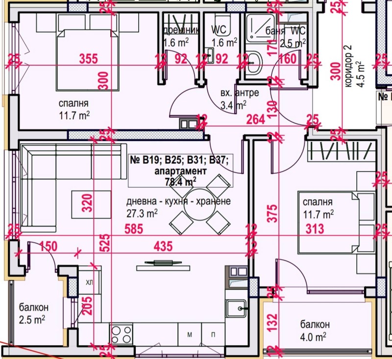 Апартаментът се състои от: антре, просторна дневна с кухненски бокс, две спални, едната с дрешник, баня с тоалетна и отделна тоалетна, две тераси.