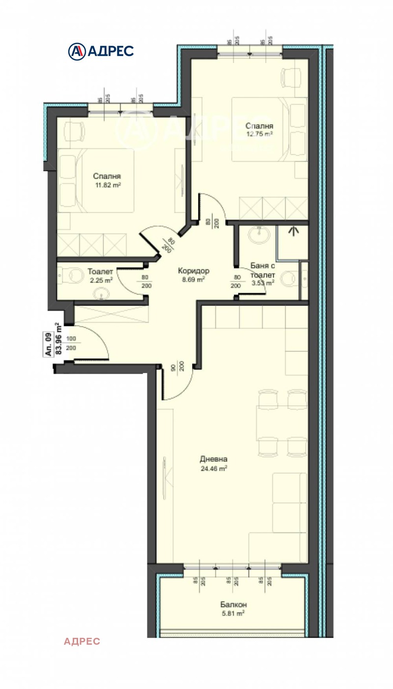 Жилището разполага с площ от 92 кв. м. разпределена в коридор, дневен тракт с кухненски бокс, две спални, балкон, баня и тоалетна, и втори санитарен възел.