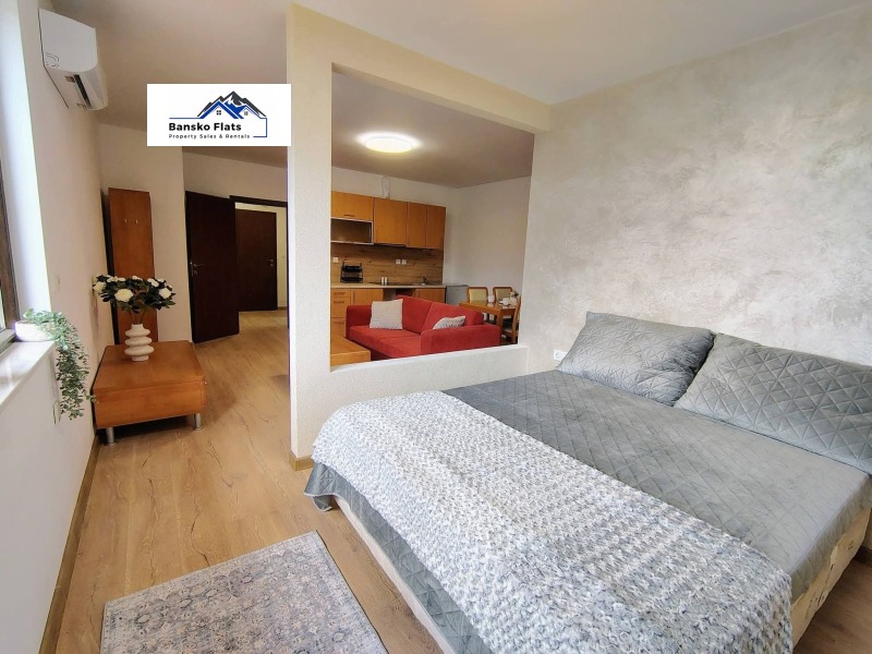 Разпределение на студиото позволява лесното му преобразуване в двустаен апартамент. Жилището напълно реновирано, с гледка към планината. Отоплява се с климатик.