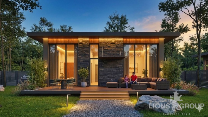 Lions Group Предлагаме за продажба модерна едноетажна къща в процес на строителство, разположена в престижния бутиков комплекс Forest Residence, в тиха и зелена зона в близост до плаж Кабакум, курорта Златни пясъци и град Варна.